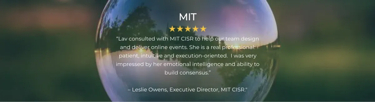 Hi, I'm Lav, a 20-year corporate executive with an infinite passion for expanding potential beyond what we thought possible. Once a Programmer, a Geneticist, Organizational Strategist, Adult Learning & Training expert, Change Management maverick, and Meditation Teacher, I merge them all as a strategic advisor and coach to organizations and leaders, to help build thriving innovative cultures.